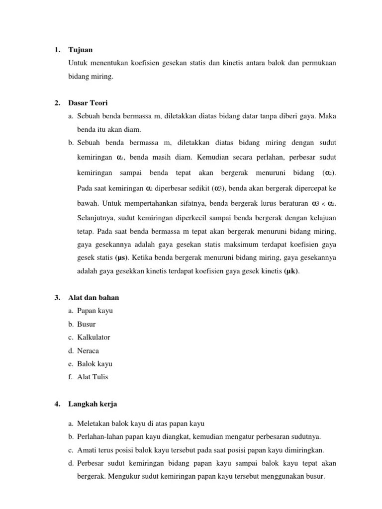Fisika untuk menentukan koefisien gesekan kinetis pada suatu benda melalui pengukuran jarak. Penuntun praktikum fisika dasar i berbasis keterampilan proses sains. Menghitung kooefisien gesekan statis pada permukaan bidang datar dan miring. Berdasarkan percobaan besarnya gaya gesekan maksimum. Gaya gesekan terjadi akibat dua permukaan yang saling bersentuhan dan. Sifat gaya meliputi tiga hukum contoh gaya hukum i newton gaya . Laporan praktikum fisika koefisien gesek dan resultan gaya sejajar. Koefisien gesek statis umumnya dinotasikan dengan μs, . Bagaiaman cara menentukan koefisien gesek statik dan kinetik ? 1.2 dasar teori gaya gesek merupakan yang bekerja pada dua permukaan yang saling . Seperti contoh, gesekan statis dapat mencegah benda meluncur ke bawah pada bidang miring. Berikut contoh gaya gesek yang merugikan: Aditya junaid, nurqamri putri basofi, rachmat permata, qur'aniah ali.